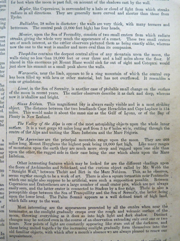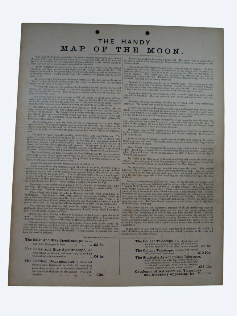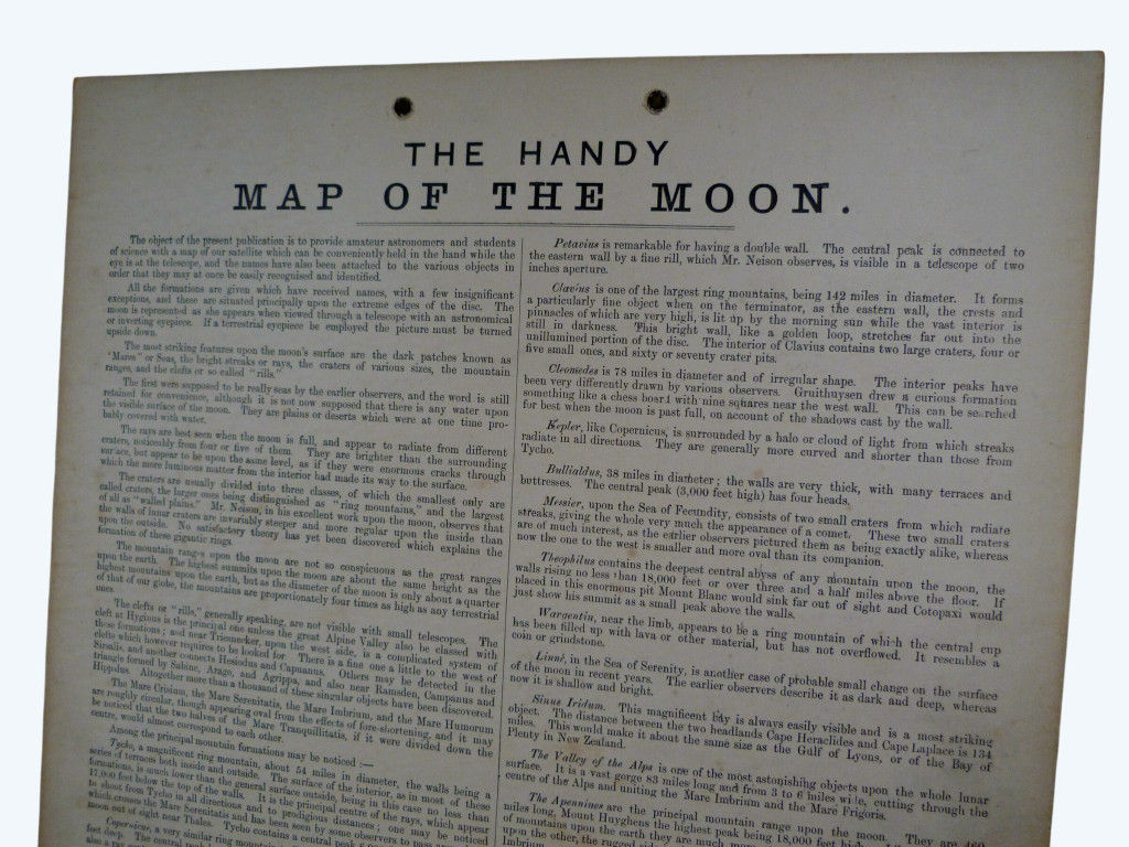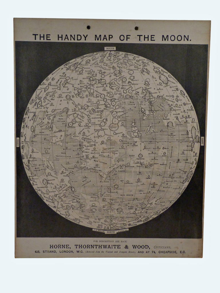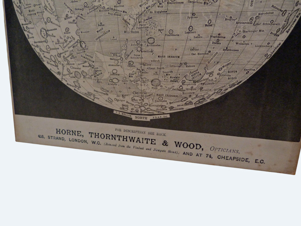 A late Victorian lunar map, issued through a firm of London opticians (Horne, Thornthwaite & Wood). The map showing the craters and oceans (about 300 are named), with the south at the top and the north at the bottom. The reverse has a description of the Moon and it's major geographical features, printed in two columns.