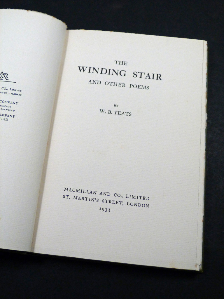 A lovely copy of the second printing of The Winding Stair, one of W B Yeats's most important collections of poetry, and containing some of Yeats's most powerful verse, including "A Dialogue of Self and Soul" and "Byzantium" (the latter being the sequel to Sailing to Byzantium from Yeats's previous book, The Tower).