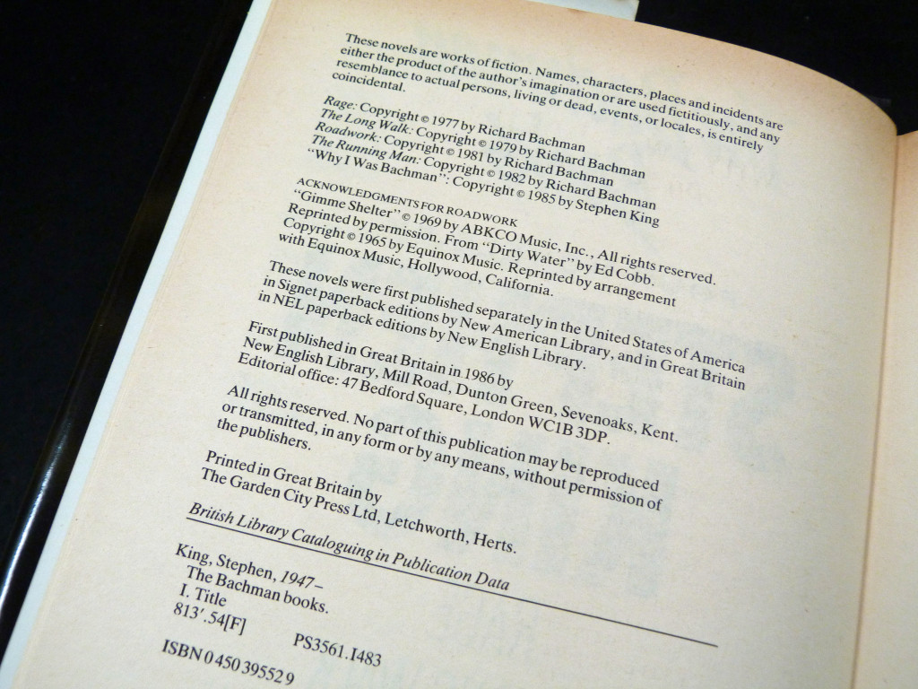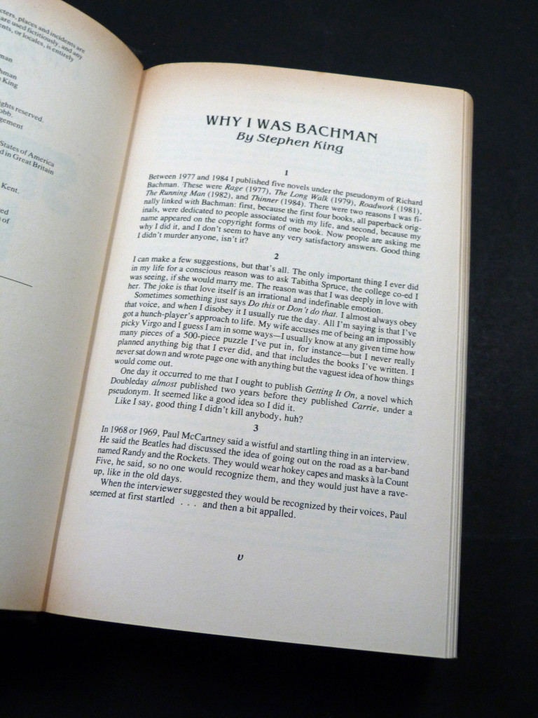 The Bachman Books is a collection of short novels by Stephen King published under the pseudonym Richard Bachman between 1977 and 1982. With an introduction by Stephen King explaining why he wrote as Bachman.