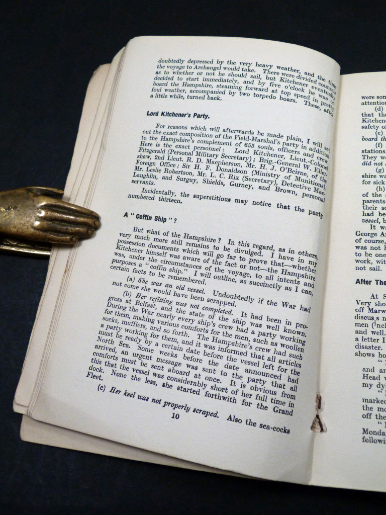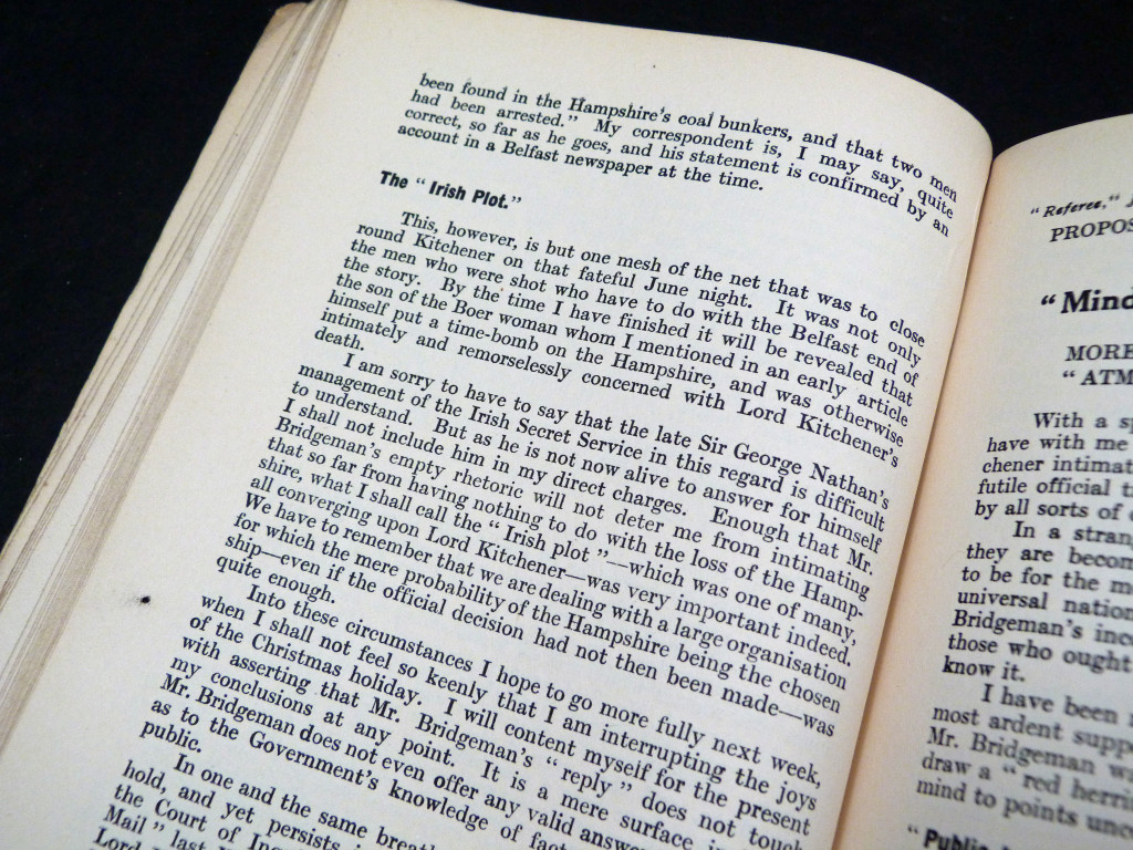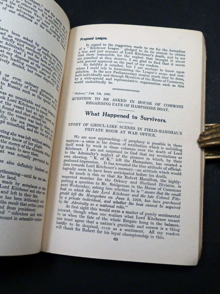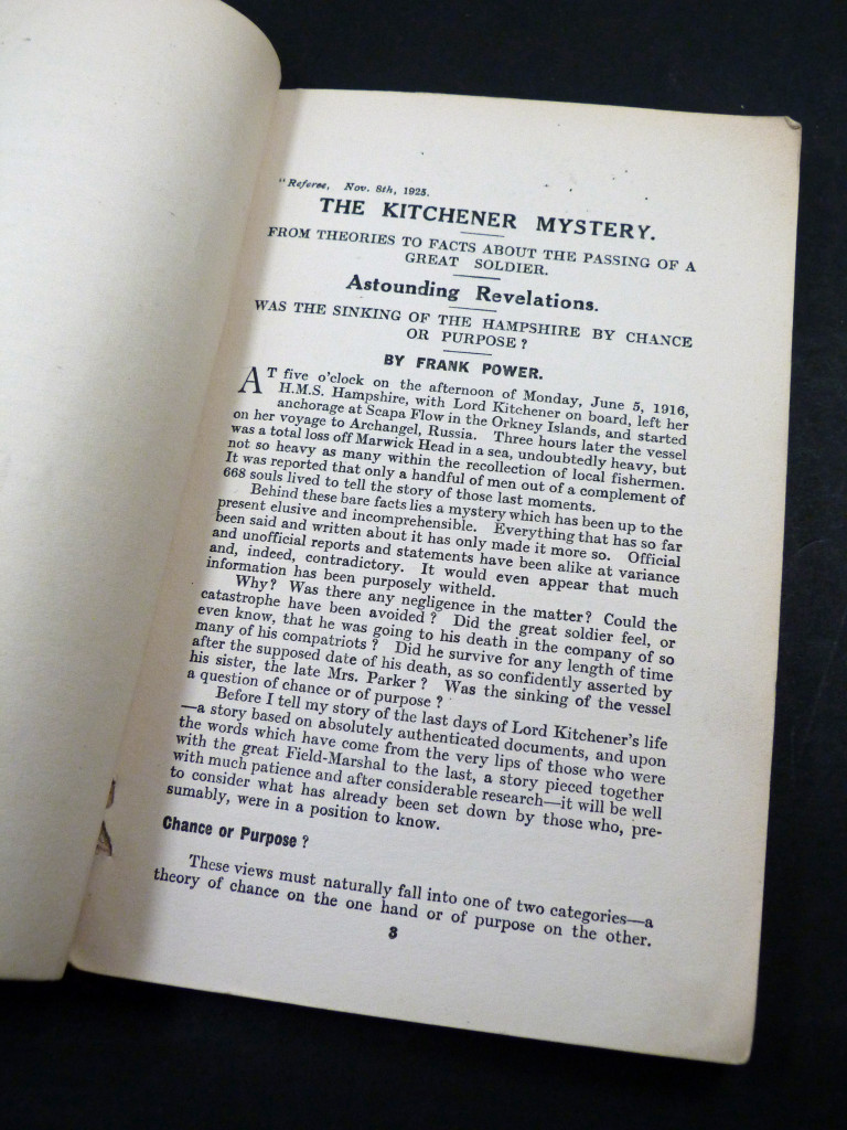 A piece of sensationalist journalism, as Frank Power explores the conspiracy theories surrounding the death of Field Marshal Lord Kitchener, questioning the official account of the sinking, the failure to rescue survivors, and implying more sinister reasons for Kitchener's death. The contents were first published in The Referee.