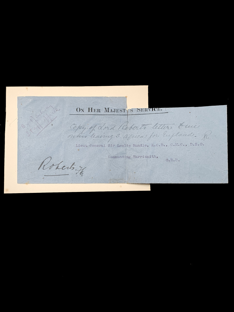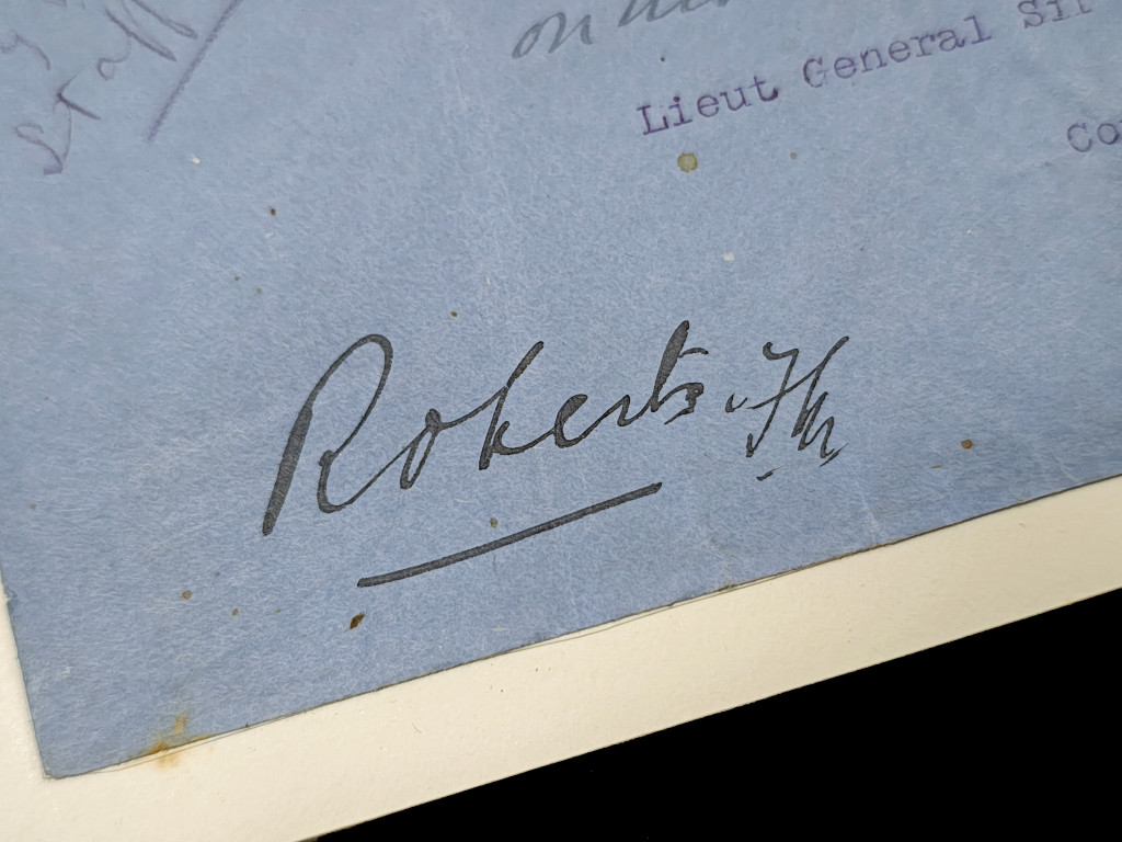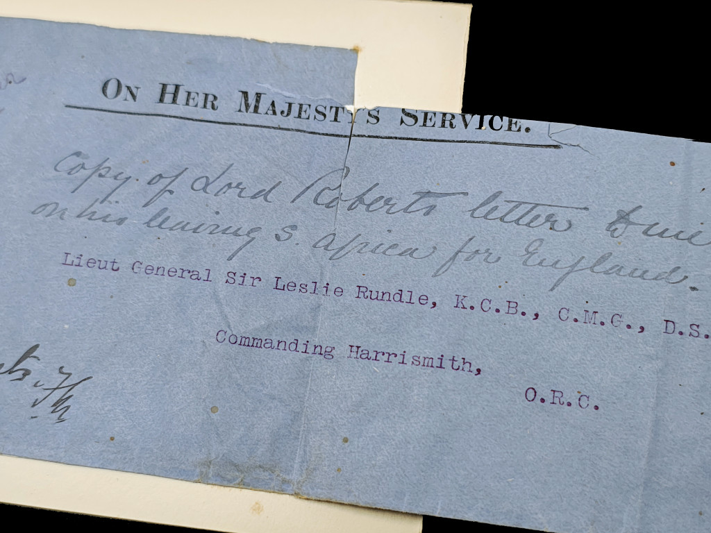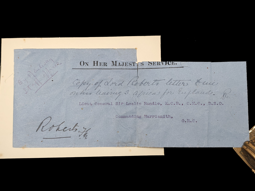 This is an original official envelope sent and signed by Field Marshal Roberts to Lt-Gen. Sir Leslie Rundle, c1902. The envelope measures 9.5 x22.5cm, and is folded vertically and is laid on a piece of card that measures 11.5 × 15.5cm.