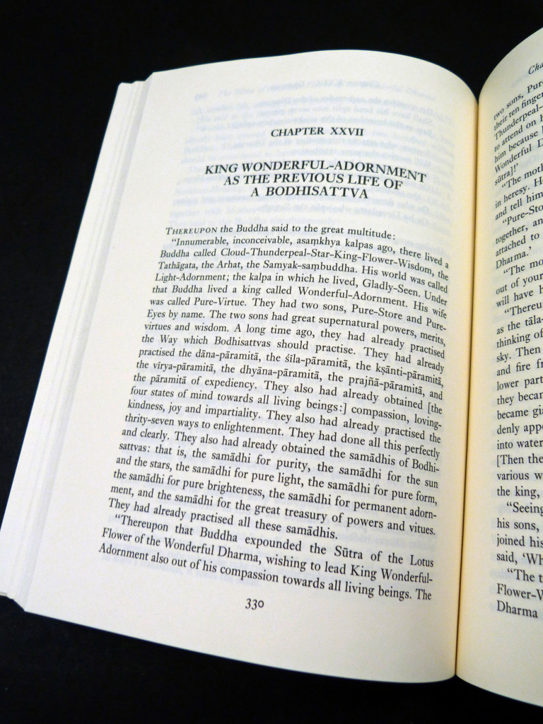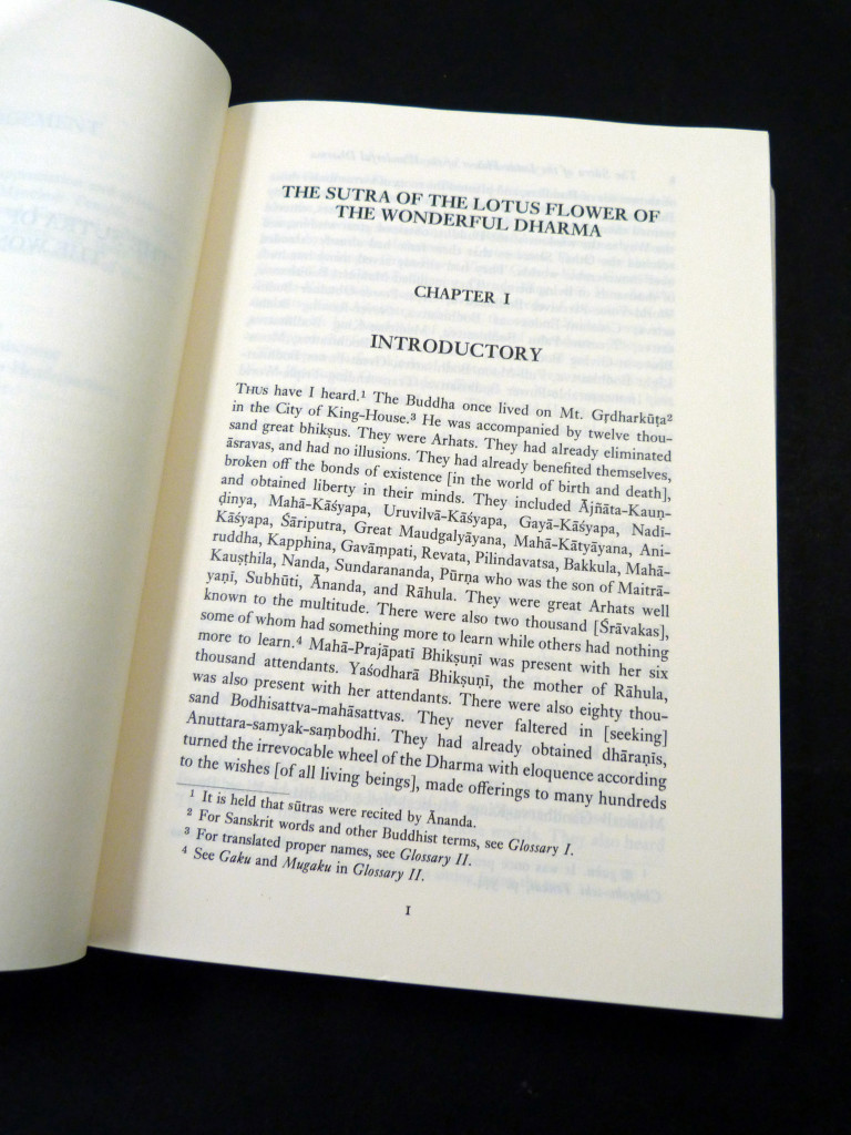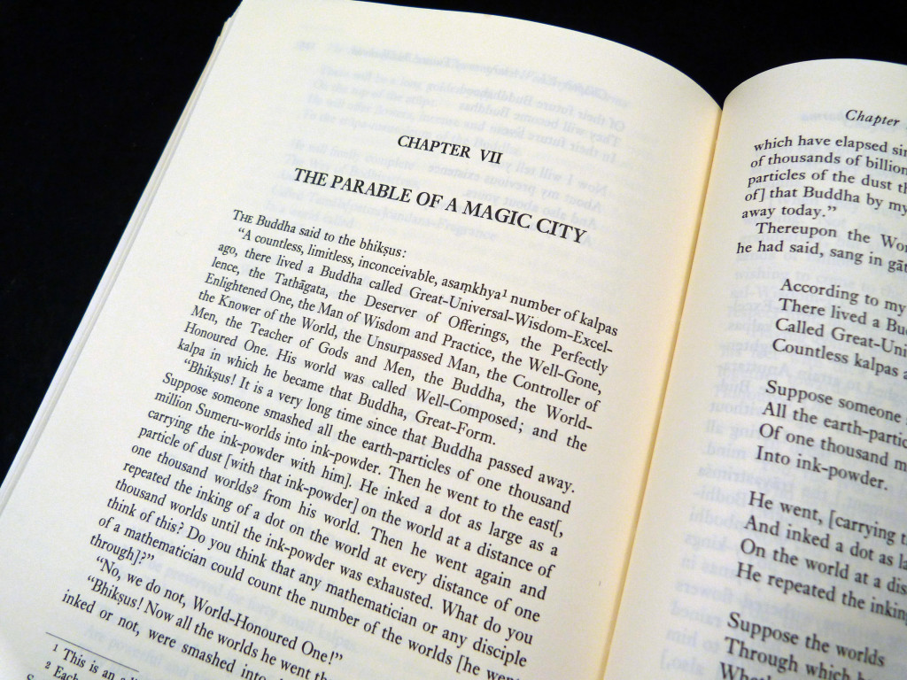 The "Lotus Sutra", as it is generally known in the West, is one of the most important of all the Mahayana sutras, and especially in Japan, where it is popularly known as the Ho-ke-kyou. It is divided into 28 chapters, of which Chapter 16, 'The Duration of the Life of Tathagata', is especially important for its eulogy of sakyamuni as the embodiment of the eternal life and as having attained enlightenment in the inconceivably remote past.