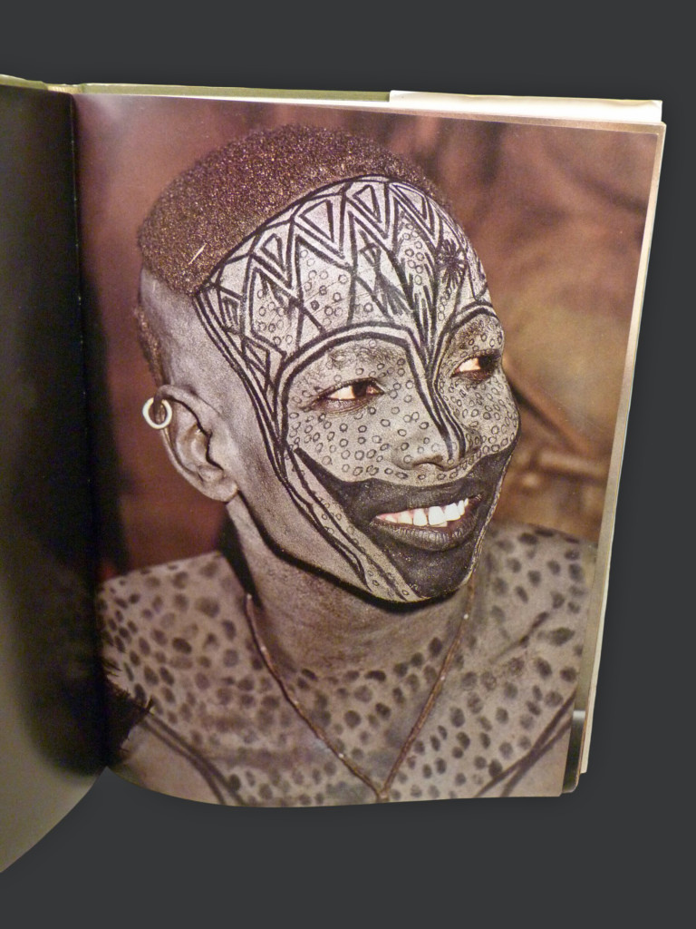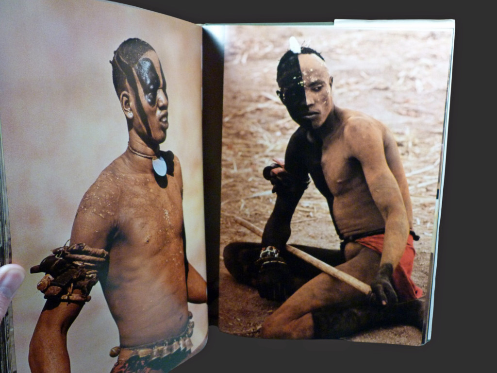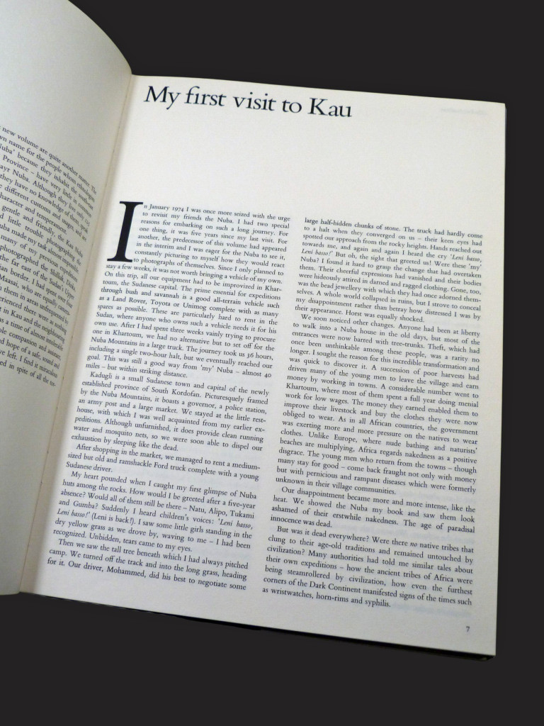 From the dustwrapper, "Leni Riefenstahl, one of the most outstanding film directors and documentary photographers of our time, here presents us with a volume of text and pictures whose unique documentary and artistic merits and contribution to cultural history make it a worthy successor to her book The Last of the Nuba which deals with the Mesakin Nuba. Although the Nuba of Kau—anthropologists call them the 'South East Nuba'—live little more than 100 miles from the gentle and peace-loving Mesakin, they speak a different language and observe different customs and conventions. A wild and passionate people, they are diametrically opposed to the Mesakin in character and temperament. Their knife-fights, dances of love and elaborately painted faces and bodies, which resemble 'living Picassos', are unequalled by any surviving primitive race on earth. Leni Riefenstahl does not claim to have captured their entire way of life in this book. She has concentrated on photographing what distinguishes the South East Nuba from other tribes of her acquaintance.