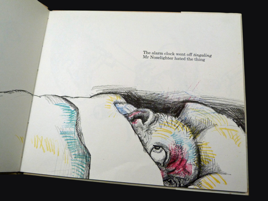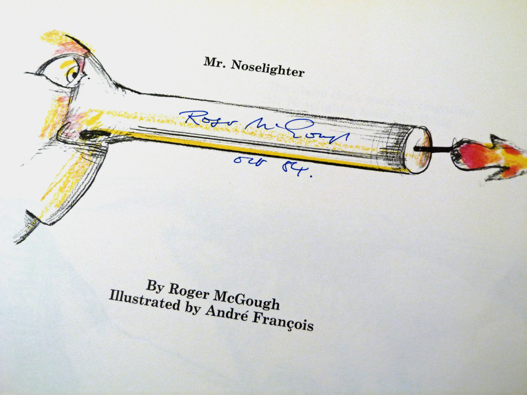 Roger McGough's first book for children. "Mr Noselighter, who has a candle instead of a nose, sets out to deliver a birthday cake to his grandmother. He loses the cake on the way, but it is restored to him by a friendly leprechaun. Mr Noselighter promises to give the leprechaun a midnight snack as a reward—but forgets. The next morning he finds he's been turned into an elephant as a punishment. An unforgettable experience." Wonderfully illustrated by Andre Francois.