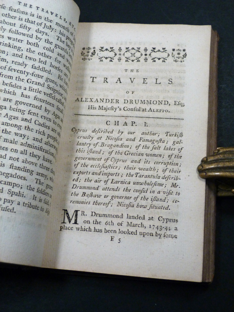 Alexander Drummond (d. 1769), was the British Consul at Aleppo and his writings describe the social and political life of the Ottoman Empire. The extracts here are from his travels to Cyprus, the Gourdin Mountains, and includes his remarks on the Tarantula and its bite.