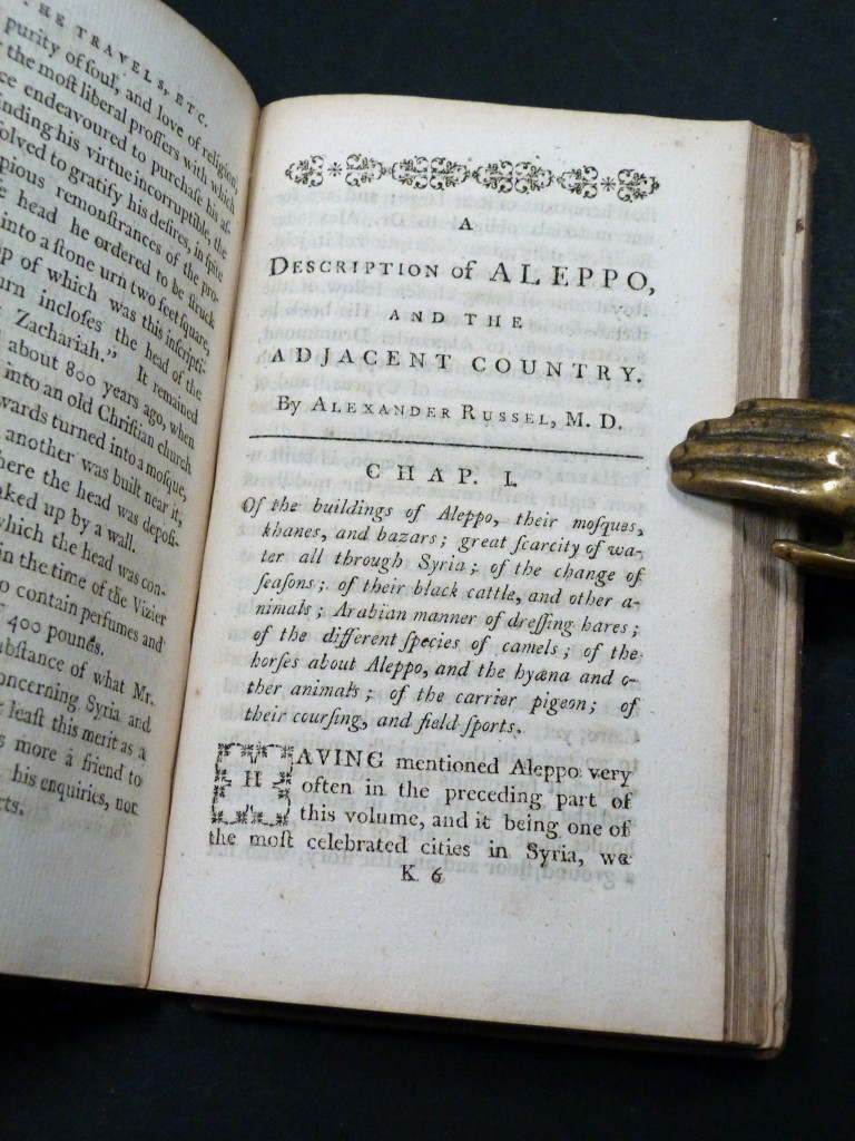 Alexander Russell (d. 1768) was a naturalist and physician who lived in Aleppo for fourteen years. His writings here describe the building, dresses, the animals, the religions, manners etc of the people of Aleppo.
